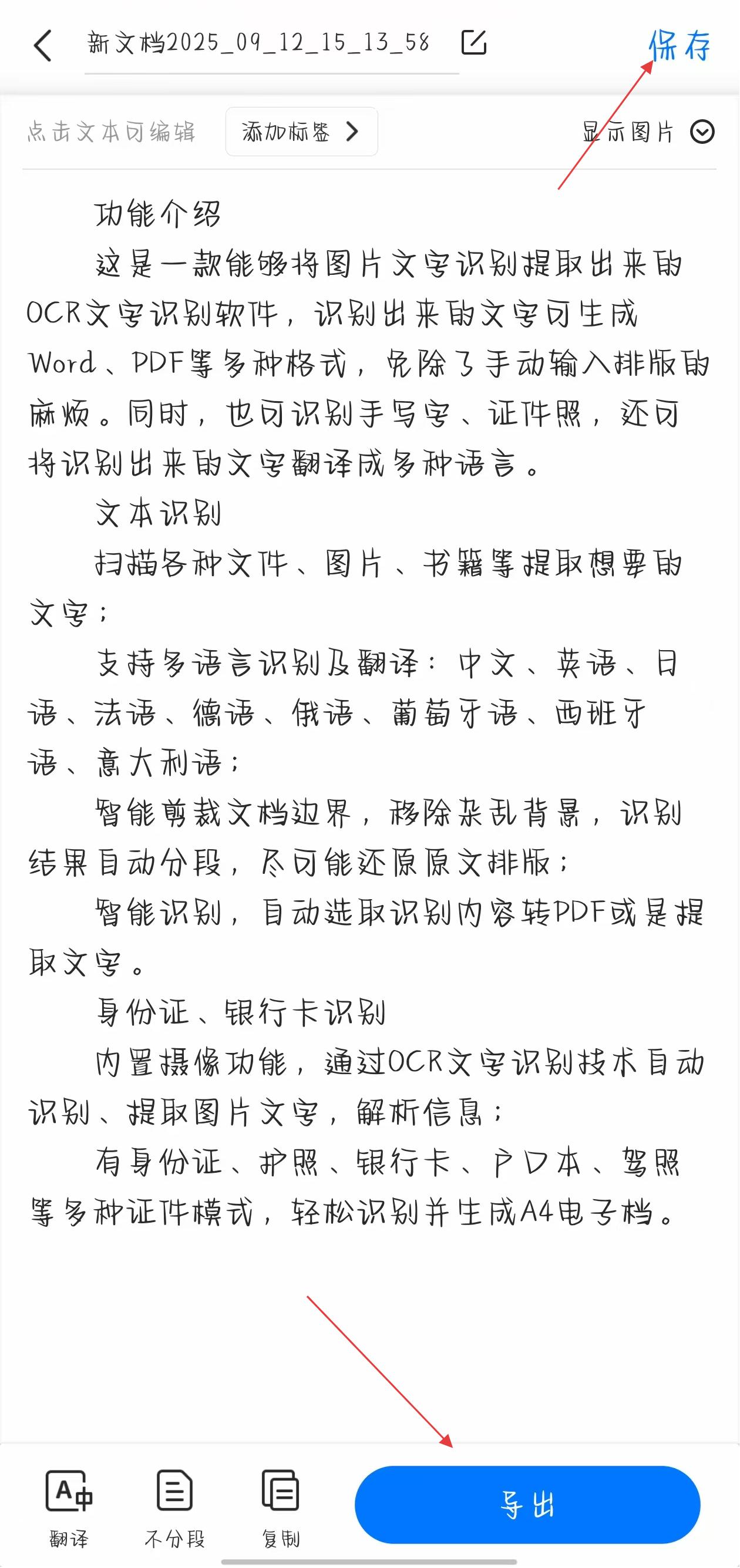 4、识别完成后,会显示提取出的文字内容,如需保存可点击右上角保存,或点击底部导出将文字以其他格式保存。