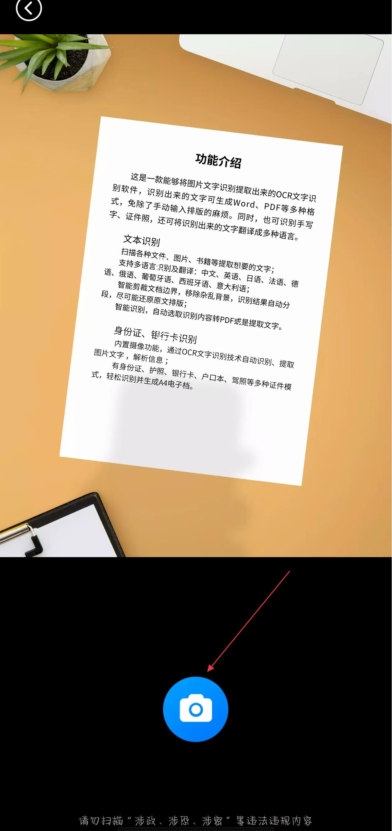 2、进入扫描界面后,对准需要识别文字的文件,点击底部的拍摄按钮。