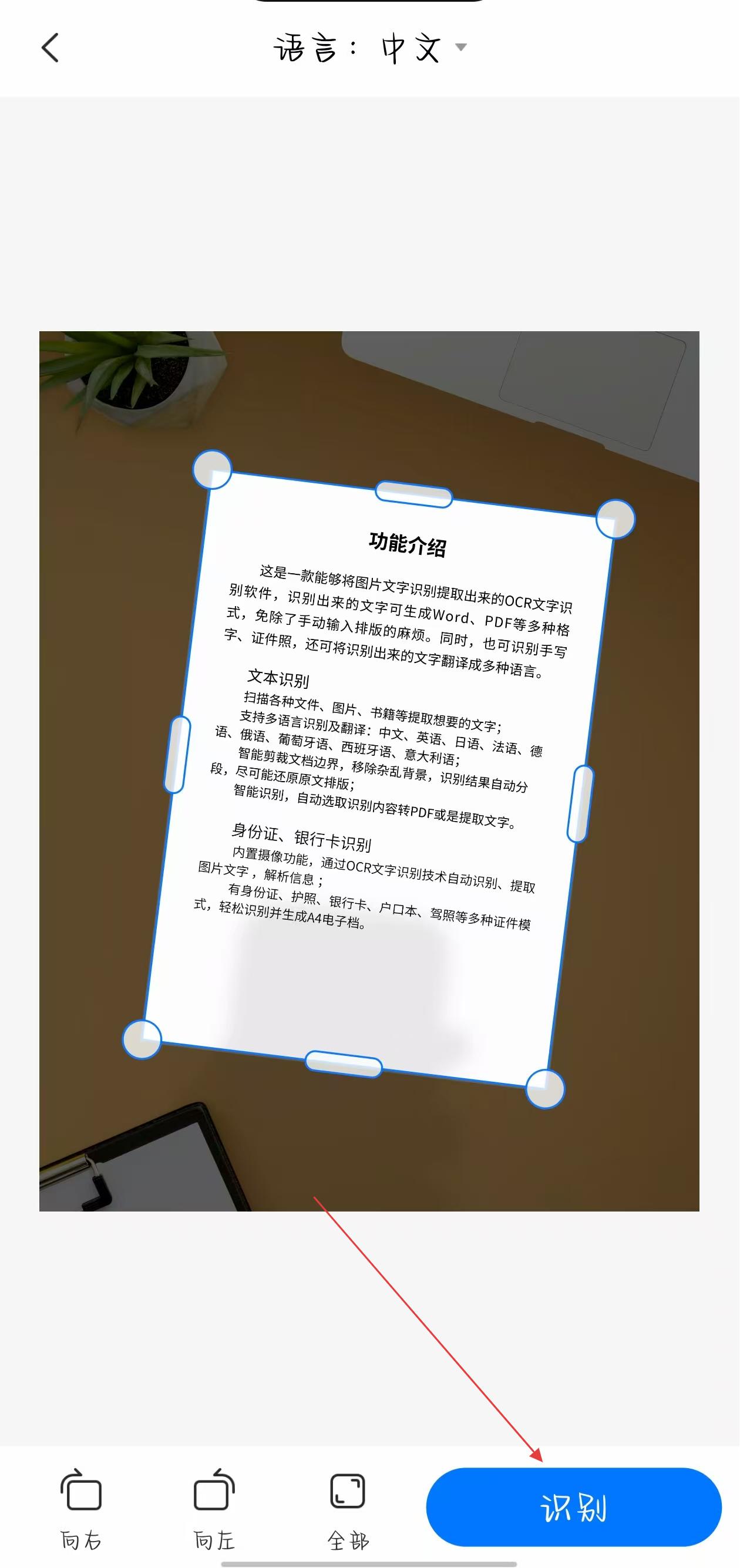 3、拍摄完成后,可调整文件的识别边框,确认无误后点击右下角的识别按钮。