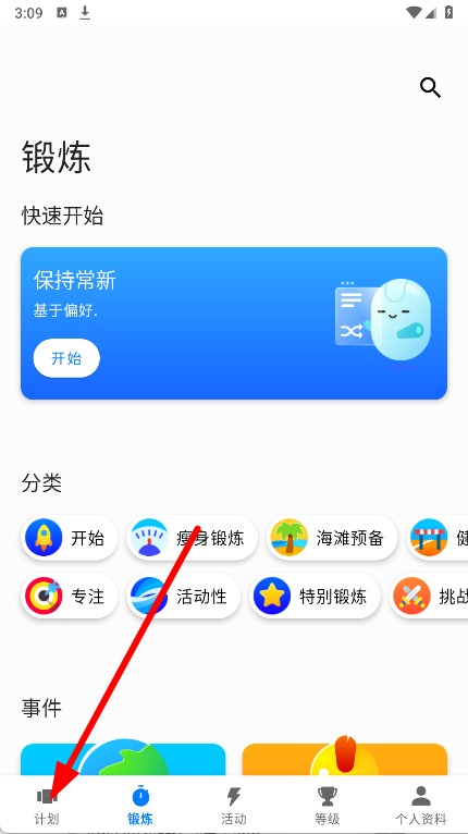 1、打开7分钟锻炼,点击底部导航栏的计划选项,进入锻炼计划页面。