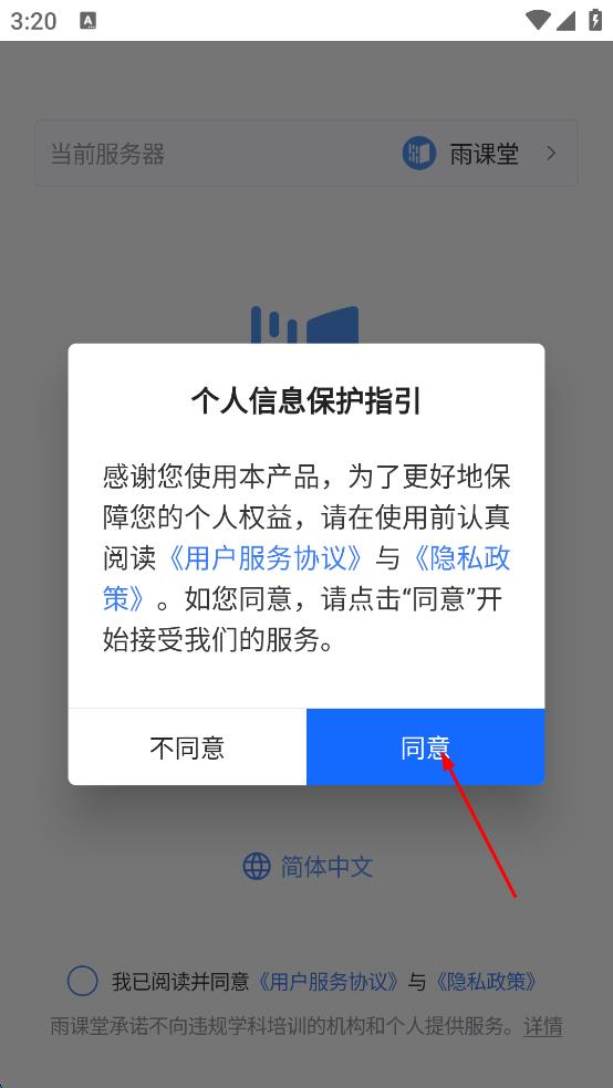 1、打开雨课堂,进入个人信息保护指引界面,界面说明为保障个人权益,需阅读用户服务协议与隐私政策,点击“同意”按钮。