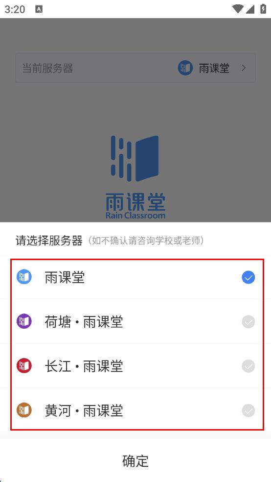 2、进入服务器选择界面,界面有“雨课堂”“荷塘·雨课堂”“长江·雨课堂”“黄河·雨课堂”等服务器选项,选择合适的服务器,点击“确定”按钮。
