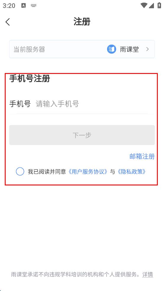4、进入注册界面,若选择手机号注册,在“手机号 请输入手机号”输入框中输入手机号,勾选协议与隐私政策,点击“下一步”按钮,继续完成注册流程。
