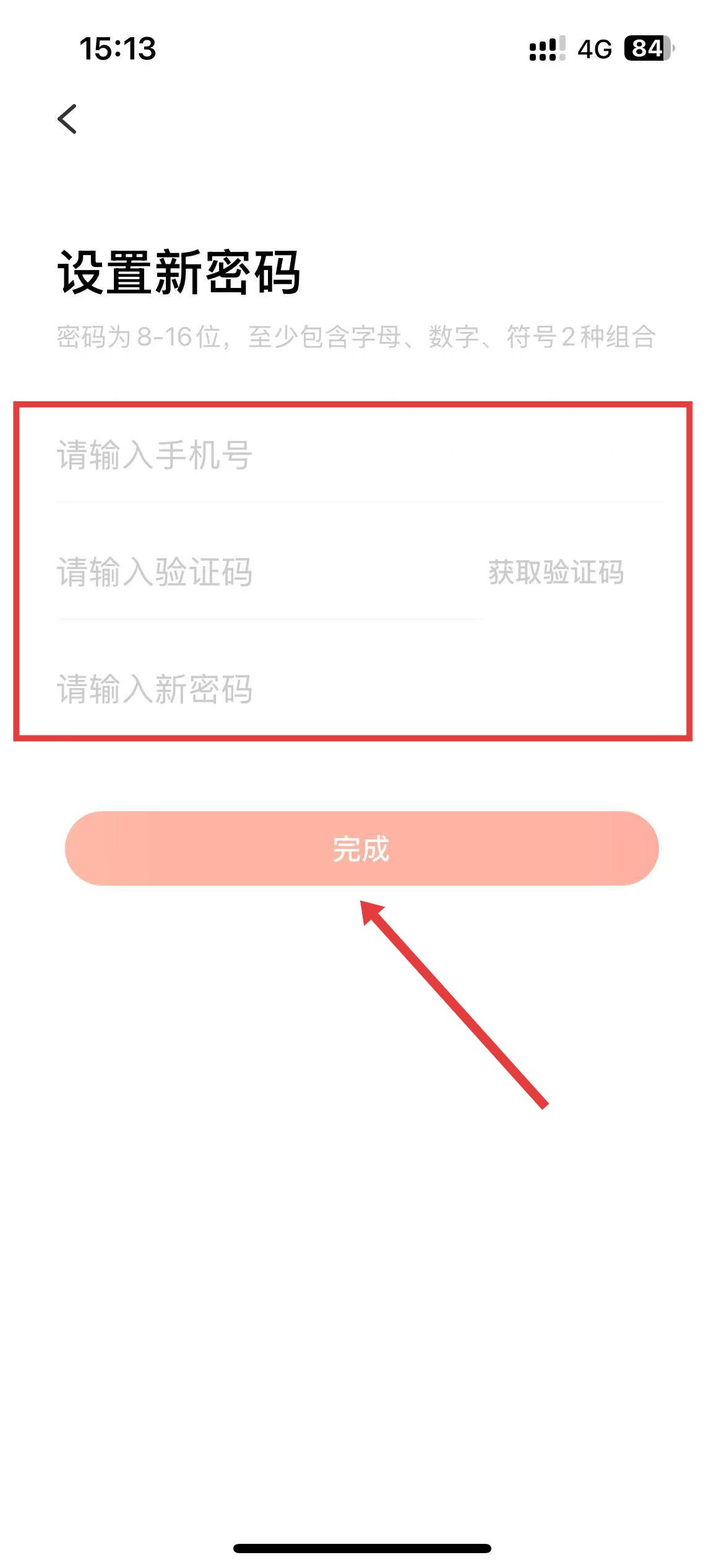 4、在设置新密码页面,按要求输入手机号,点击获取验证码,接着设置新密码,完成后点击完成即可。