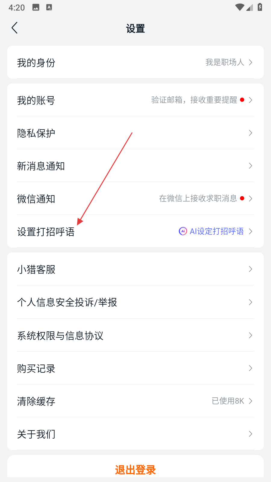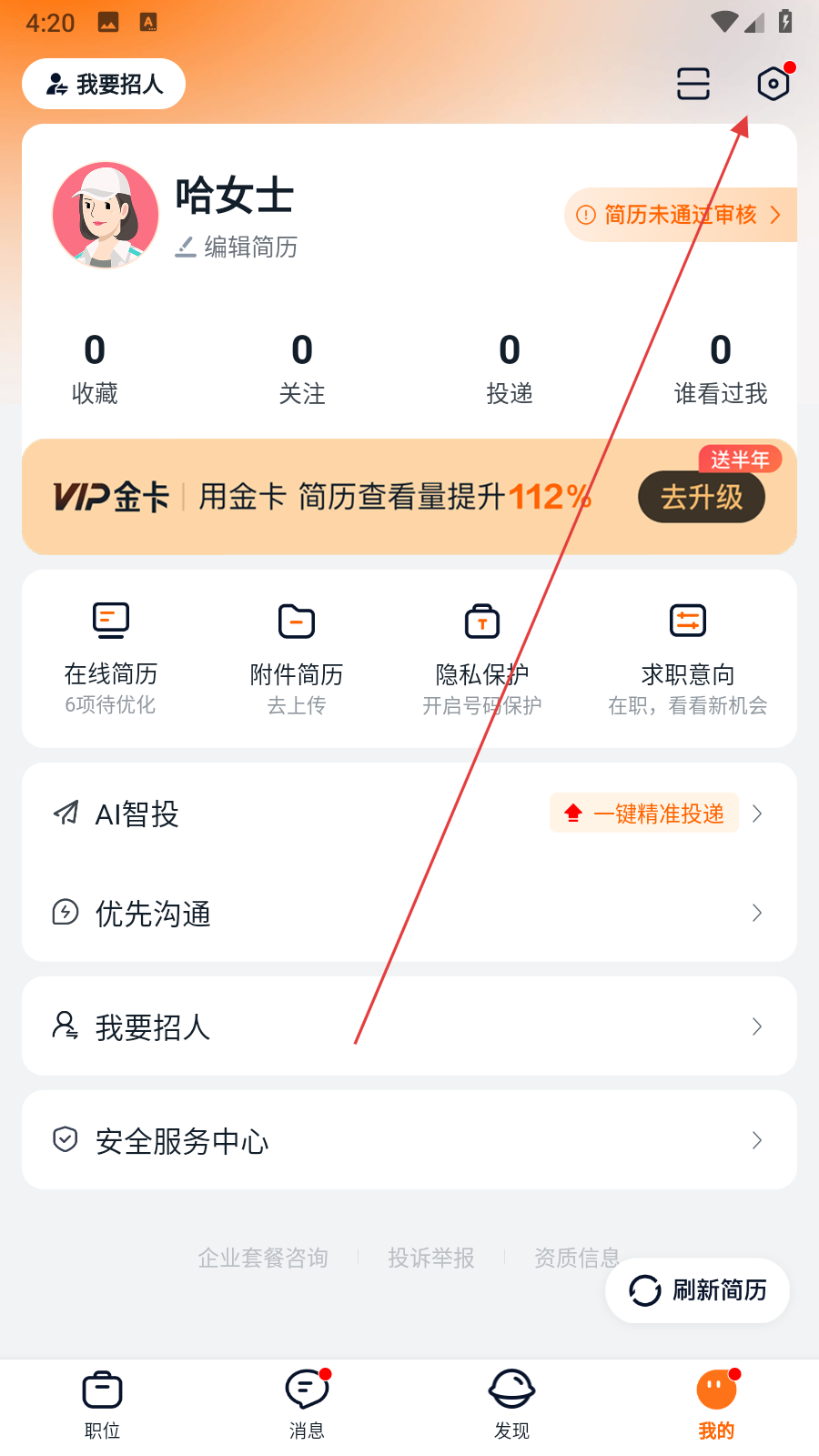 1、打开猎聘APP,进入我的页面,点击右上角的设置图标。
