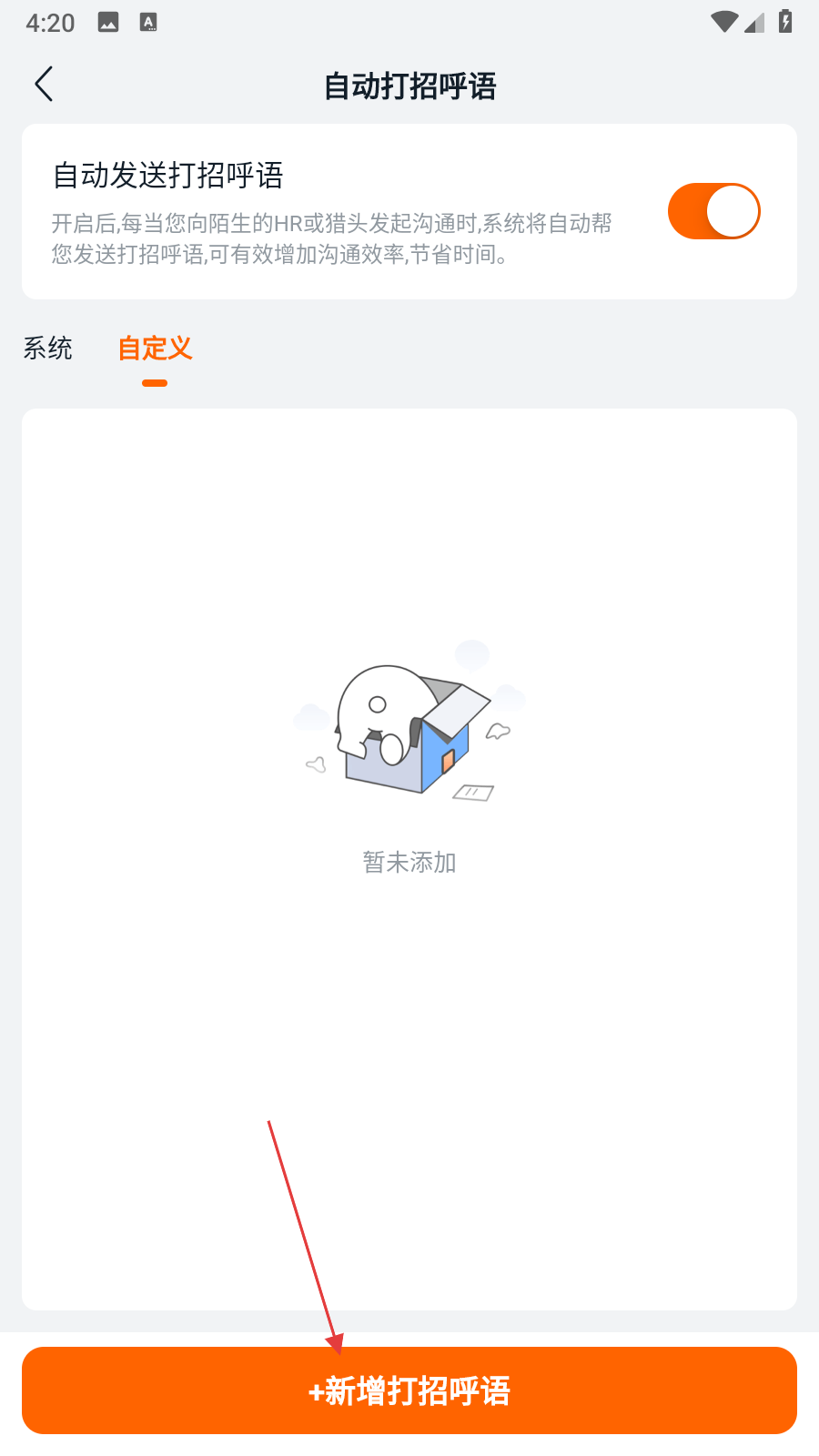 3、进入自动打招呼语页面后,点击底部的+新增打招呼语按钮。