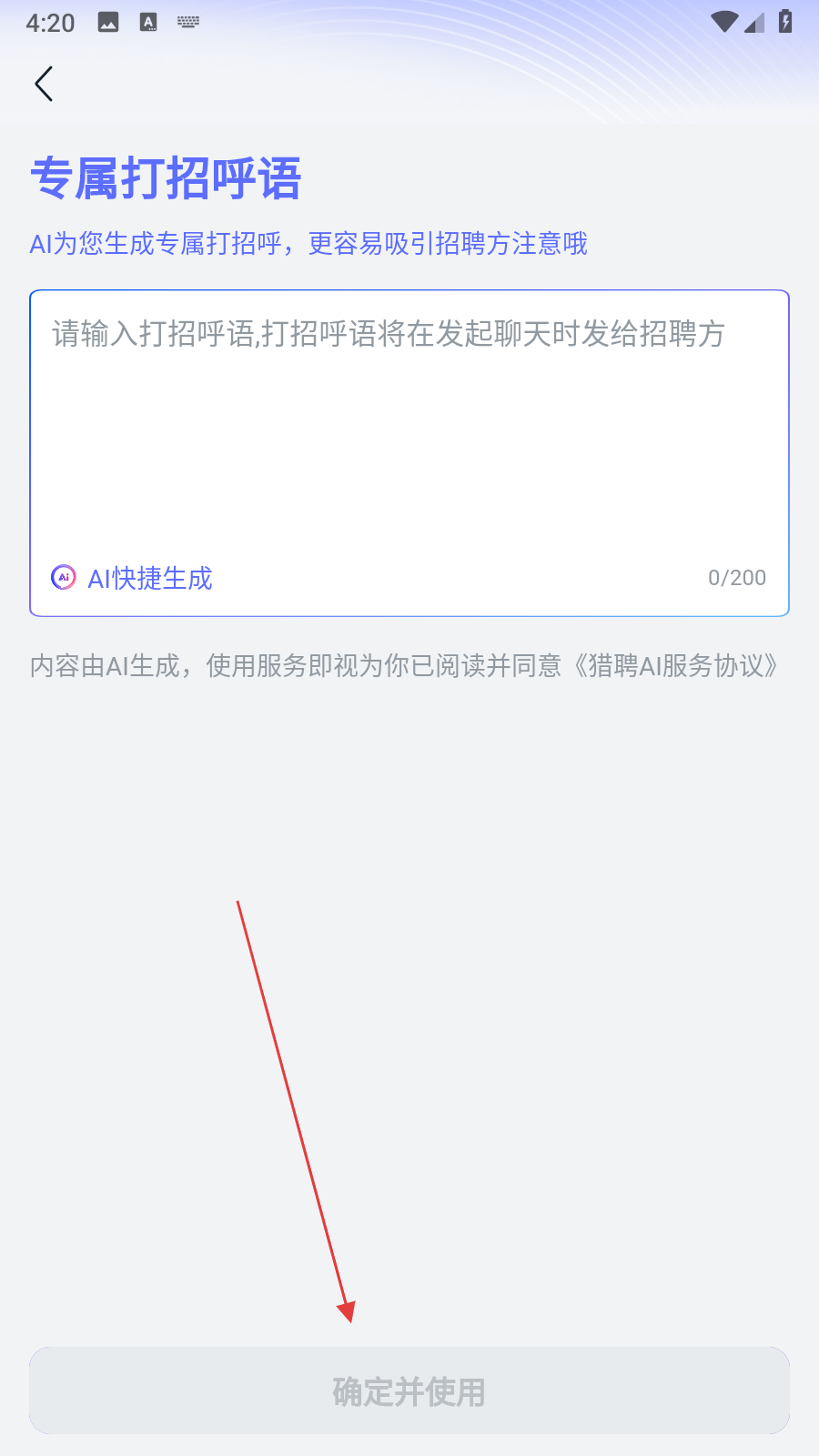 4、在专属打招呼语页面,输入要设置的打招呼语,然后点击确定并使用按钮。