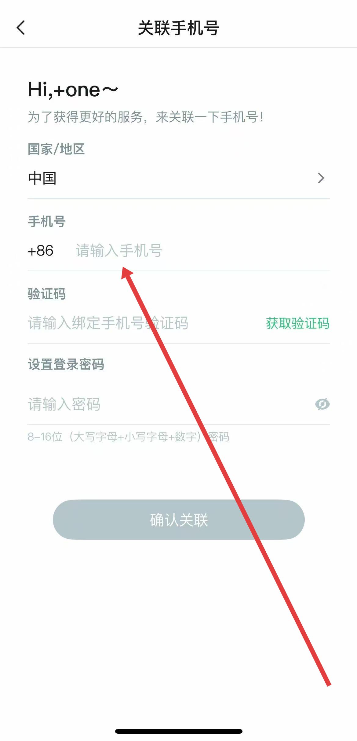3、在关联手机号页面,输入新的手机号,获取并输入验证码,设置登录密码,点击确认关联完成换绑。