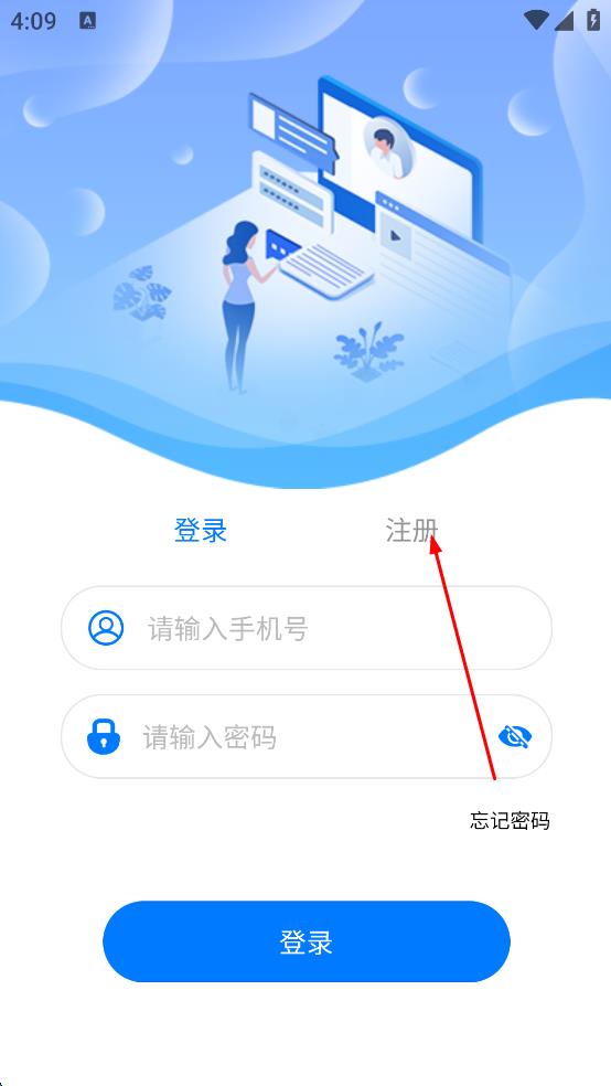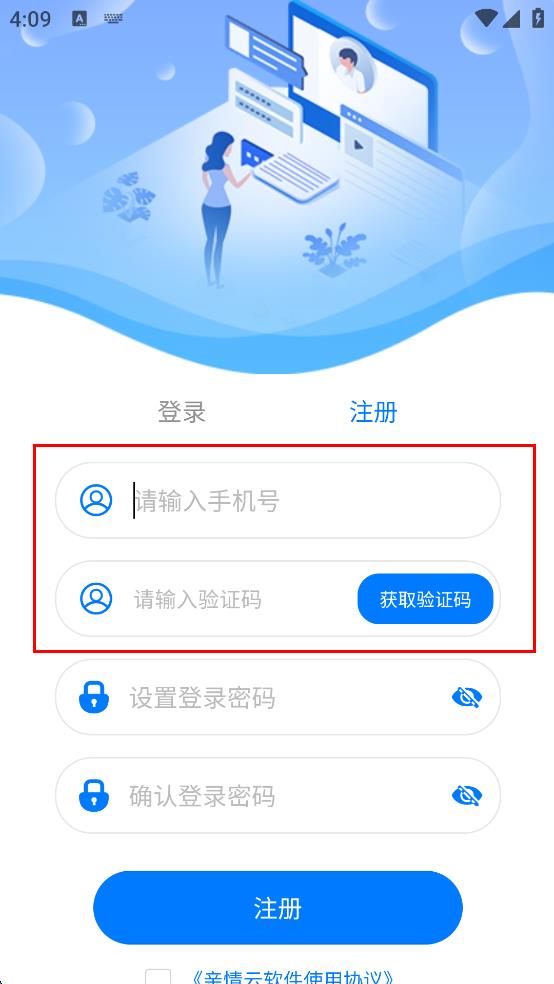 1、打开亲情云,进入登录注册界面,界面有“登录”“注册”选项,还有手机号、密码输入框,点击“注册”选项。