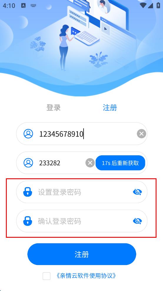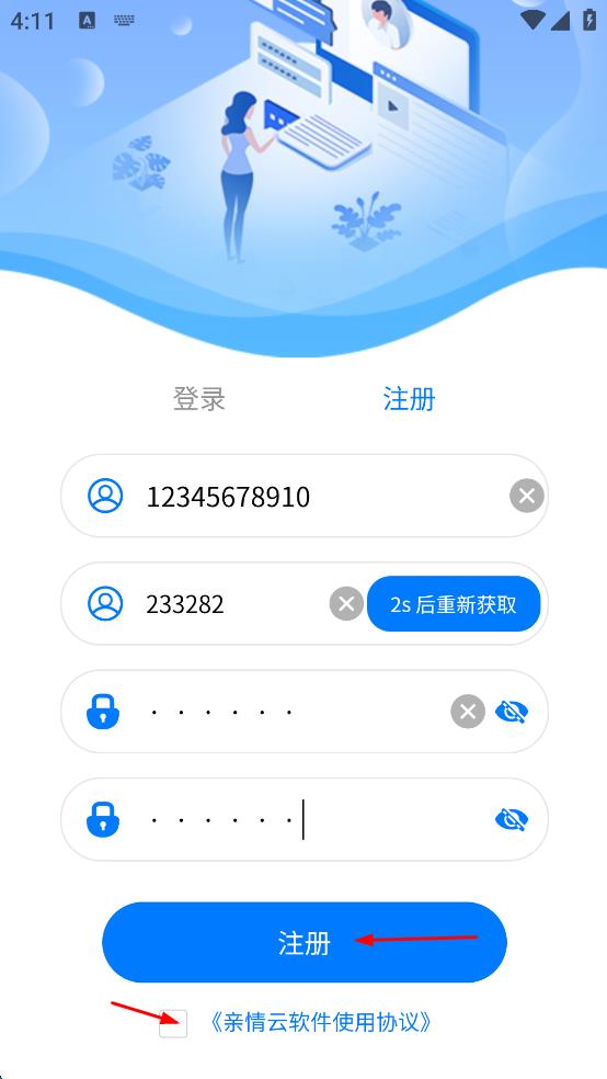 4、设置好密码后,勾选亲情云软件使用协议,点击“注册”按钮,完成亲情云账号注册操作。