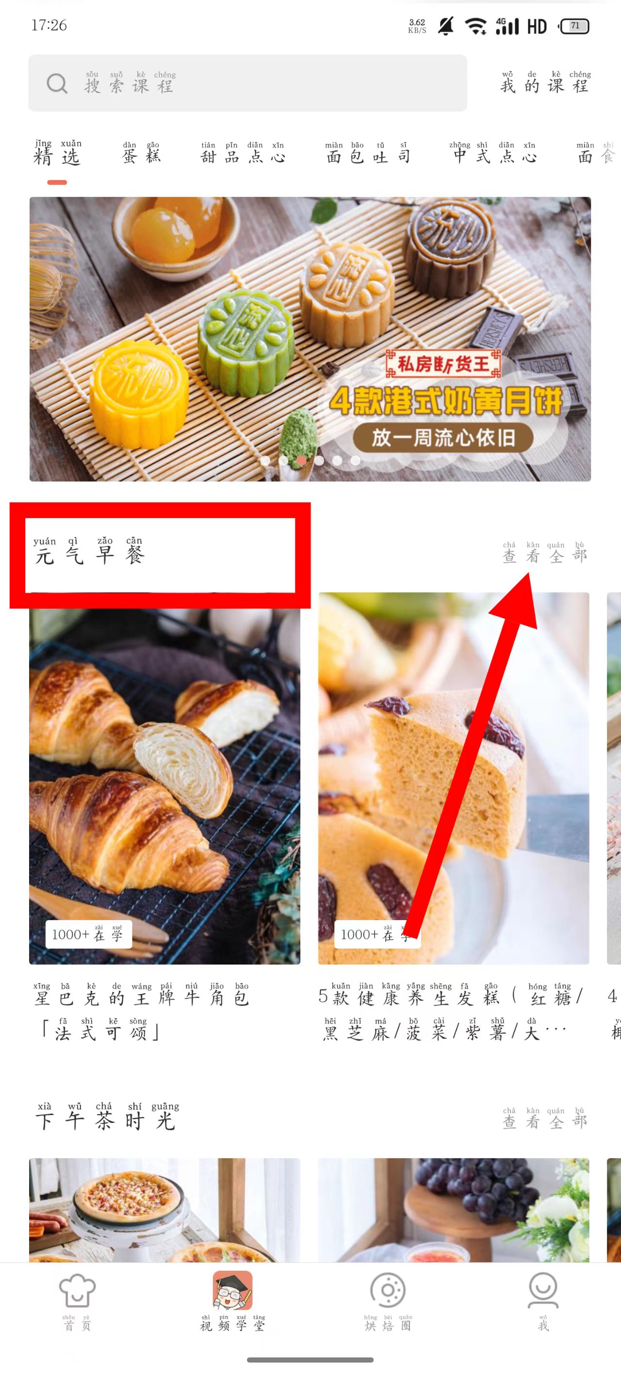 2、在视频学堂页面,找到元气早餐板块,点击查看全部按钮。