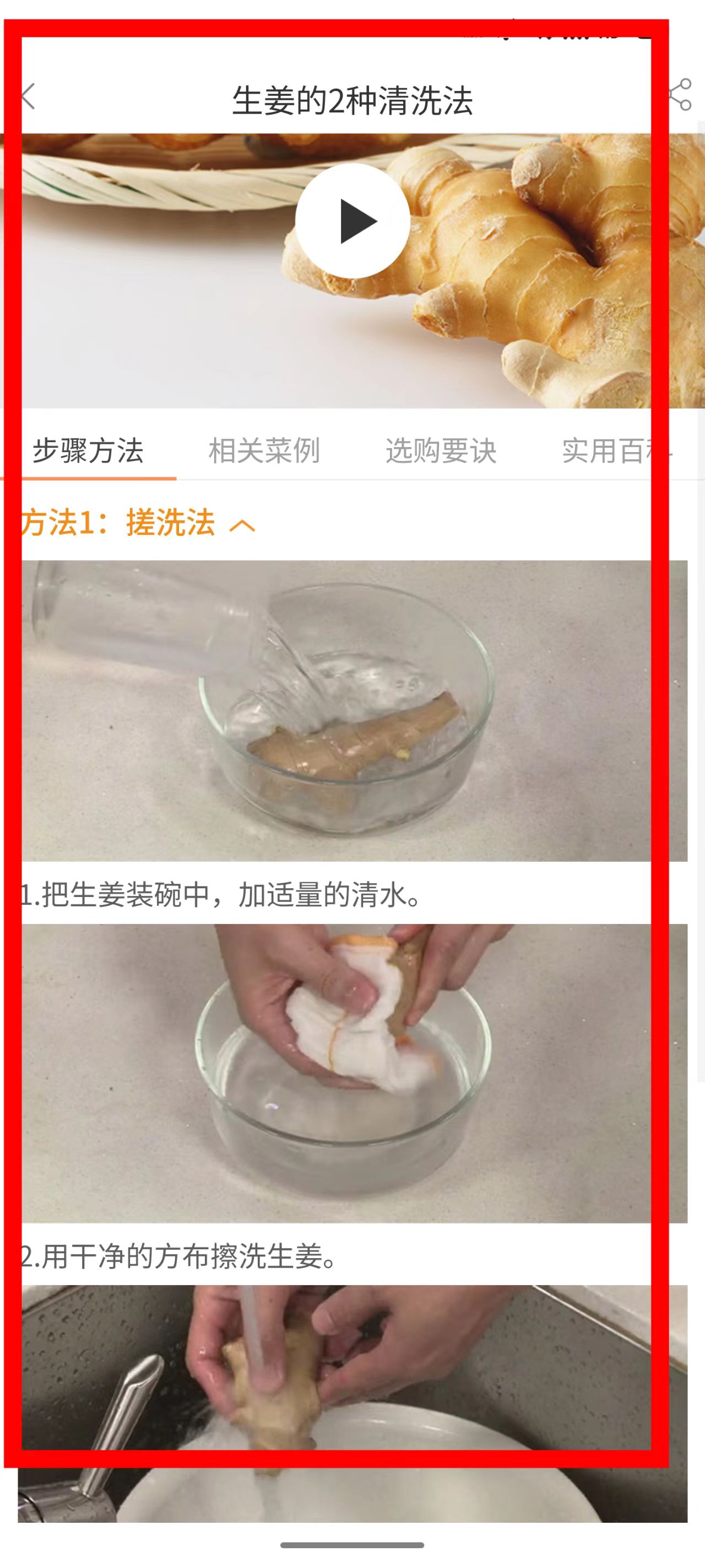 4、查看生姜清洗的步骤方法,通过图文及视频形式学习生姜的清洗技巧。