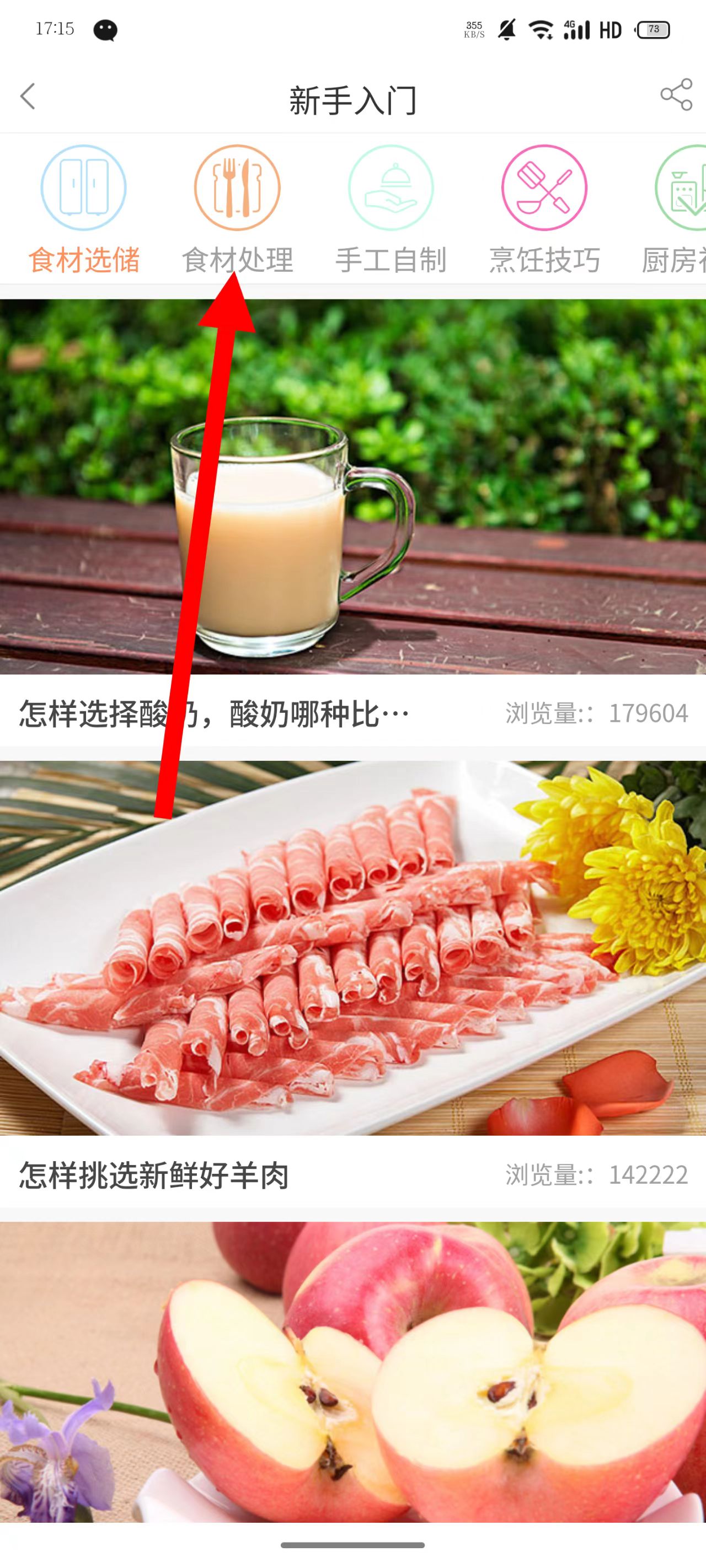 2、在新手入门页面,点击食材处理分类标签,切换到食材处理相关内容列表。