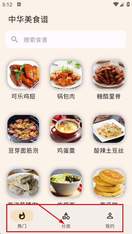 1、在中华美食谱应用首页,点击底部分类,进入分类页面。