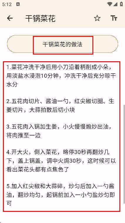 4、进入干锅菜花详情页后,可查看干锅菜花的做法步骤。