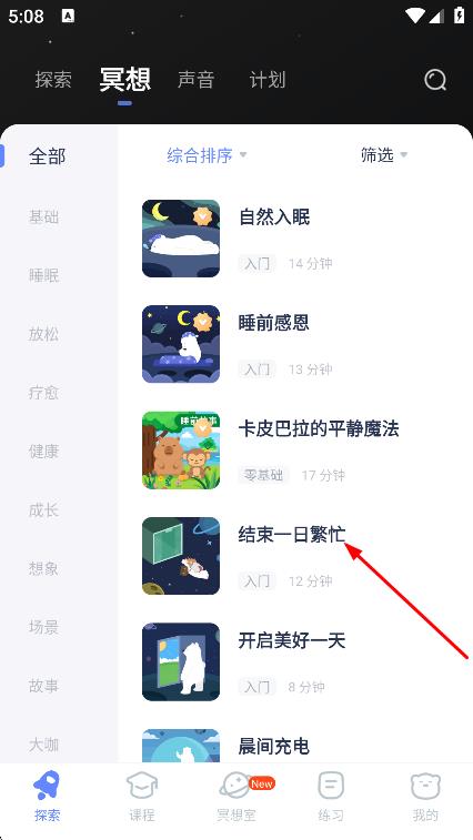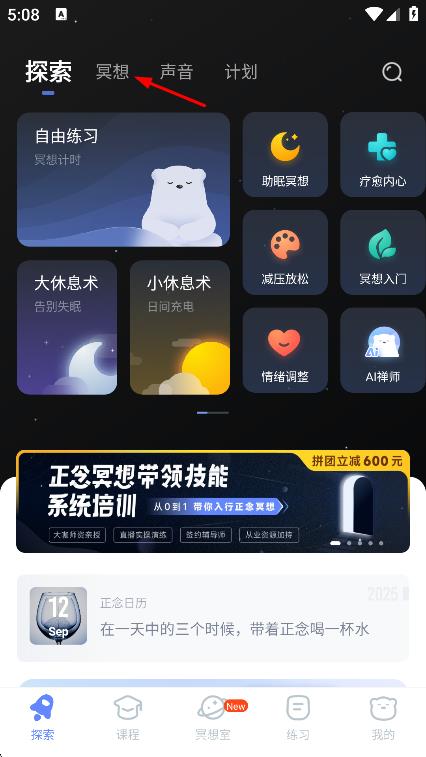 1、在应用的探索页面,点击冥想,进入冥想内容页面。