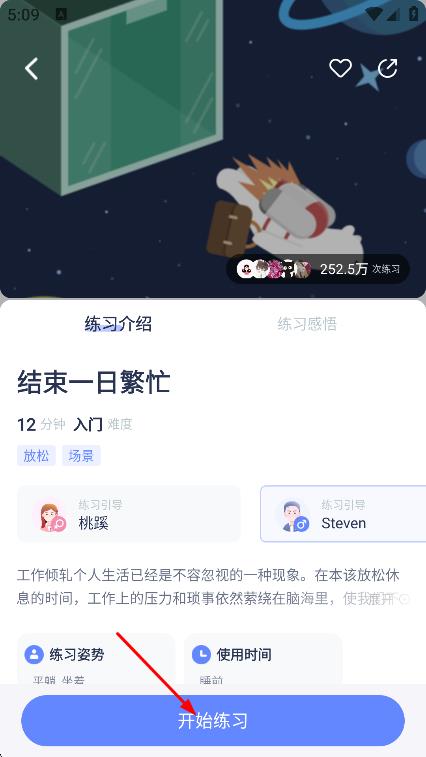 3、进入结束一日繁忙练习详情页后,点击开始练习,开始冥想练习。
