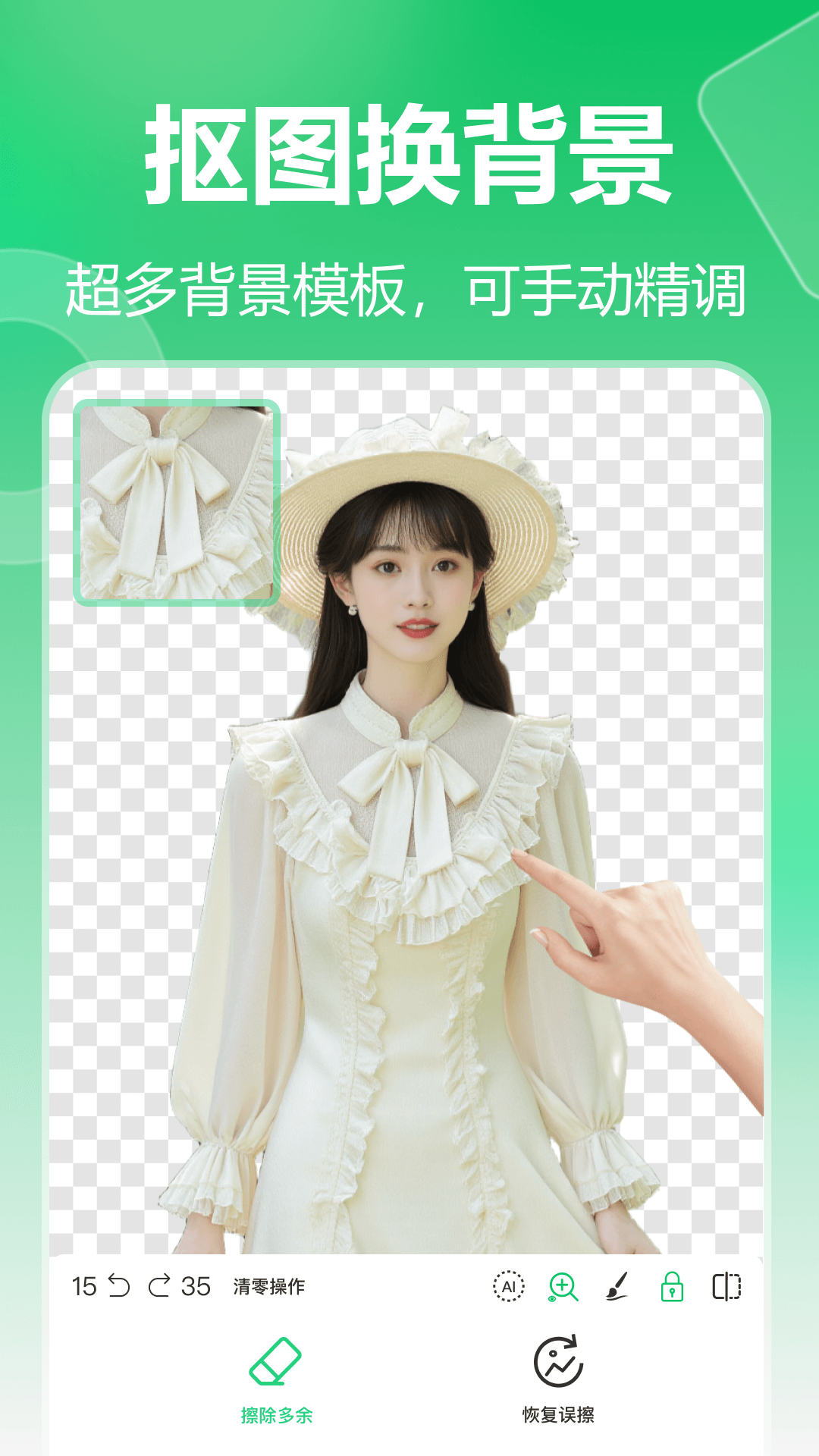 采用先进的抠图技术,能够智能识别主体,为用户精准抠图更换背景;