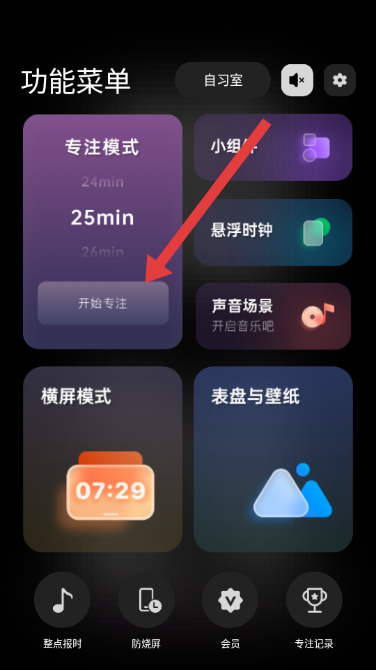 1、在翻页时钟的功能菜单界面,点击专注模式中开始专注,进入专注模式设置页面。