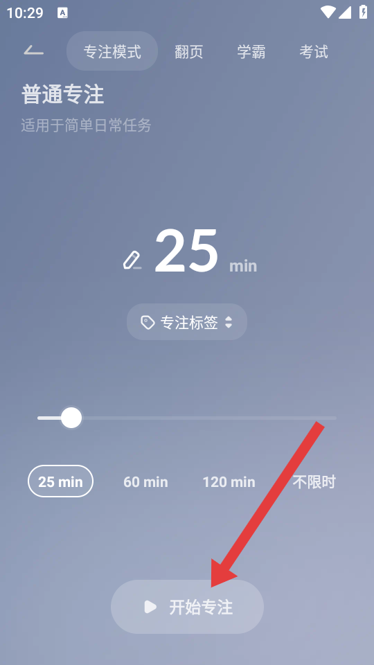 2、在专注模式设置页面,点击底部的开始专注按钮,启动专注计时。
