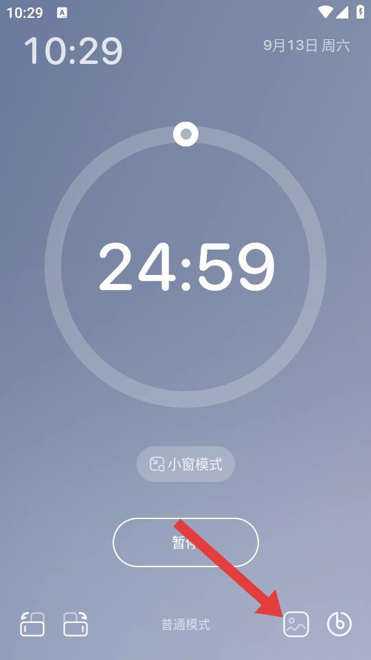 3、在专注计时界面,点击右下角的背景图图标,进入专注背景选择页面。