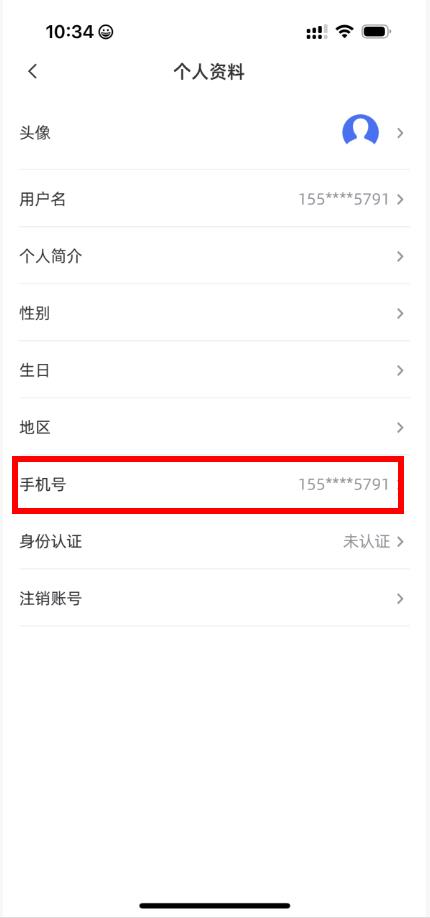 2、进入个人资料页面,在个人资料页面中找到手机号选项并点击。