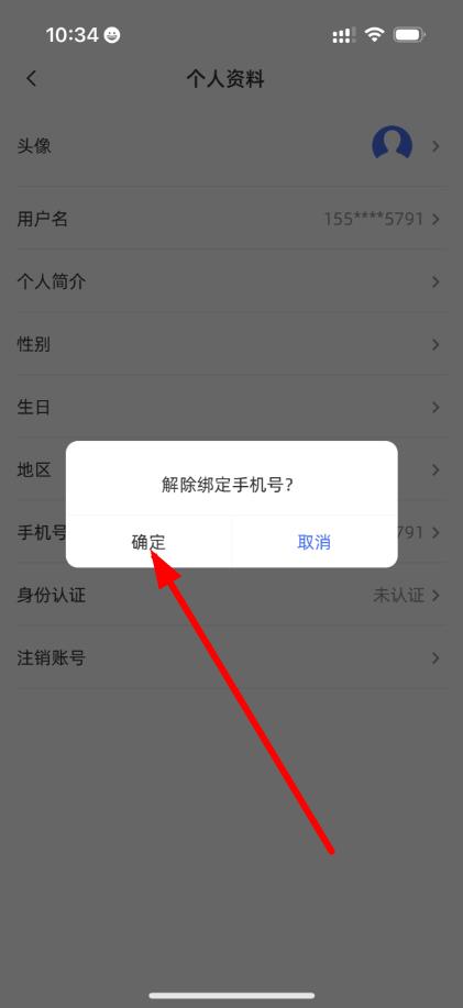 3、在弹出的解除绑定手机号确认框中点击确定。