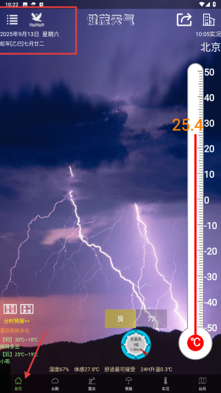 1、打开镇霞天气应用,在首页查看北京市的天气情况,当前温度25.4℃等信息。
