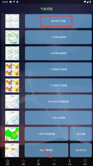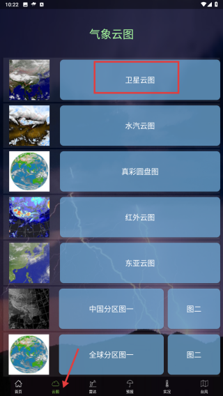 2、点击底部云图选项,进入气象云图页面,点击卫星云图选项,查看卫星云图相关气象信息。