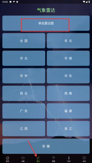 3、点击底部雷达选项,进入气象雷达页面,点击单站雷达图选项,查看单站雷达图气象数据。