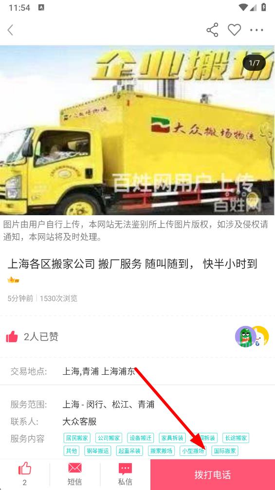 4、进入详情页后,找到页面中的拨打电话按钮,点击该按钮,即可联系对应的搬家服务。