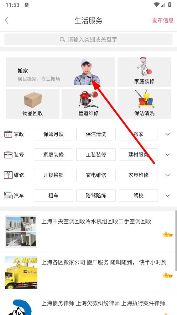 2、进入生活服务界面后,在众多服务类别中,点击搬家图标。进入搬家服务页面。