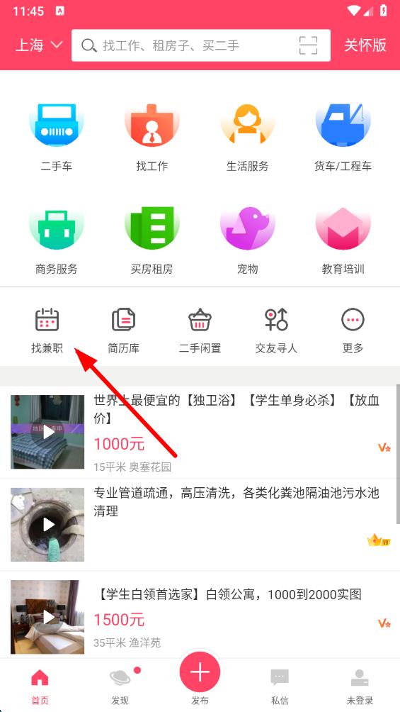 1、打开百姓网app,在首页中找到并点击找兼职选项,进入兼职信息页面。