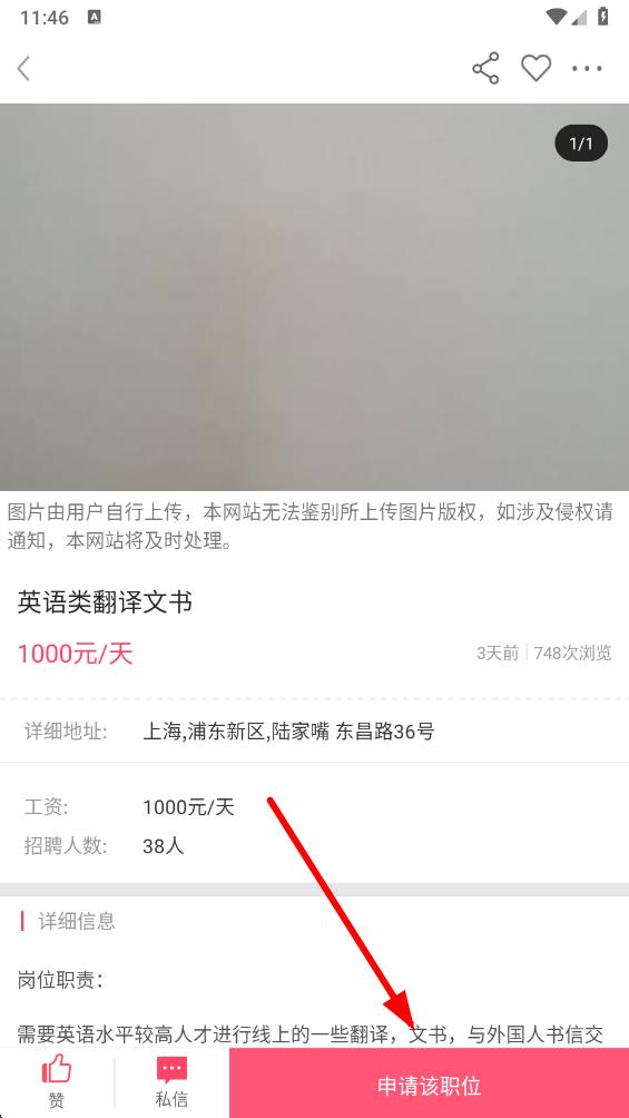 5、在详情页中查看岗位的详细地址、工资、招聘人数等信息,确认合适后,点击申请该职位,按照提示完成申请操作。