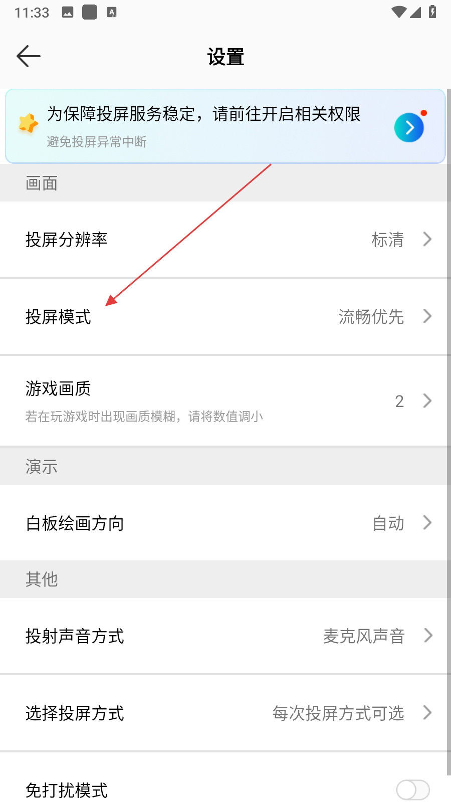 3、在设置界面里,找到投屏模式选项,点击投屏模式。