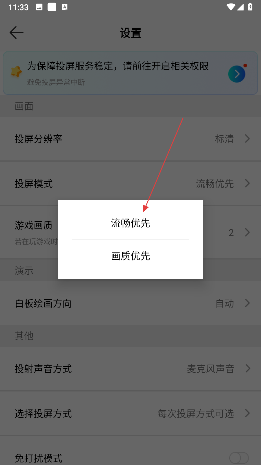 4、根据使用需求选择投屏模式,点击流畅优先或者点击画质优先。