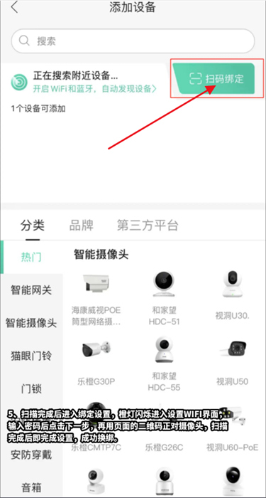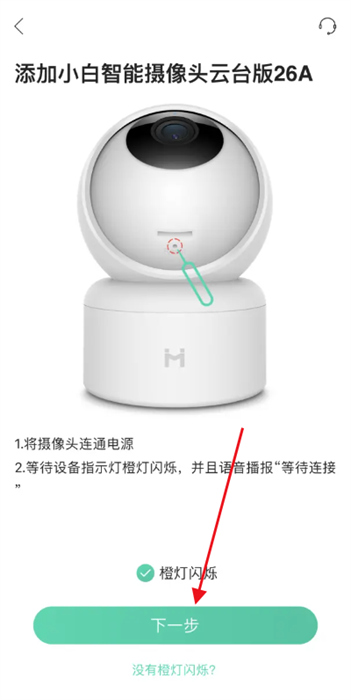 4、紧接着,在搜索到周围的设备之后,摄像头会闪烁橙光,并按照这里的指示点击【下一步】;