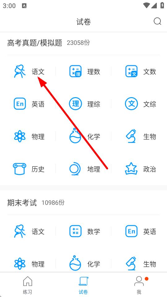 2、在试卷页面中,选择想要练习的科目,例如语文。