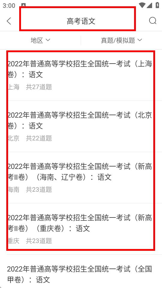 3、进入对应科目页面后,会看到不同年份、地区的试卷列表,选择一份想做的试卷,点击进入试卷详情页。