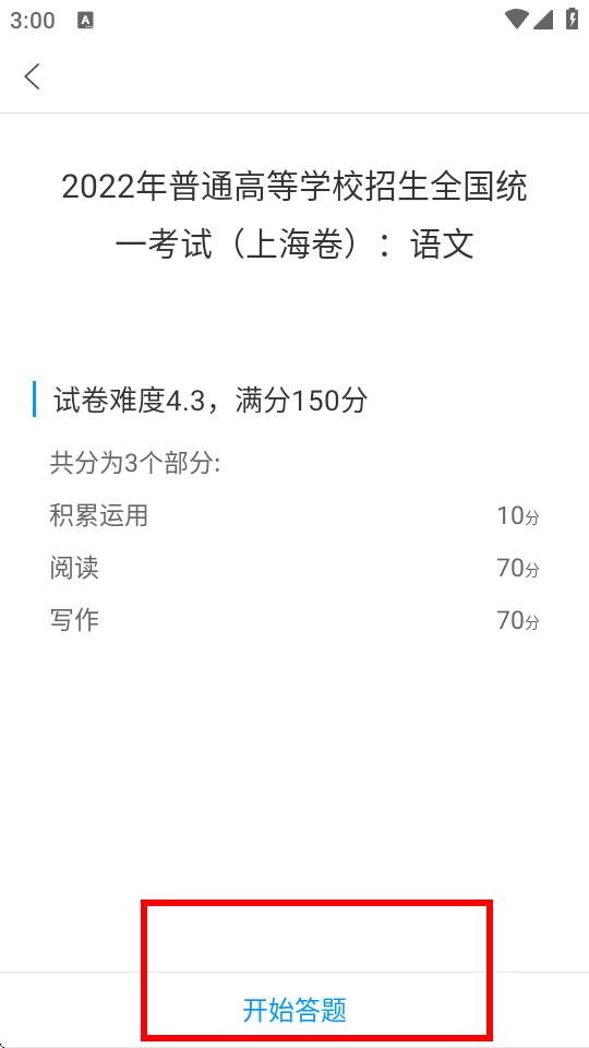 4、在试卷详情页中,查看试卷的难度、满分、题型分布等信息,确认后点击开始答题按钮,即可开始做题。