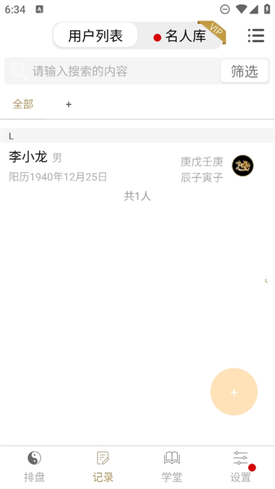 2、在记录中可以看到自己添加的一些用户记录,方便下次可以继续进行排盘不会重复输入;