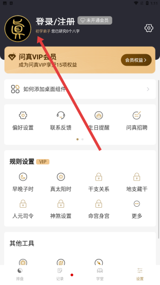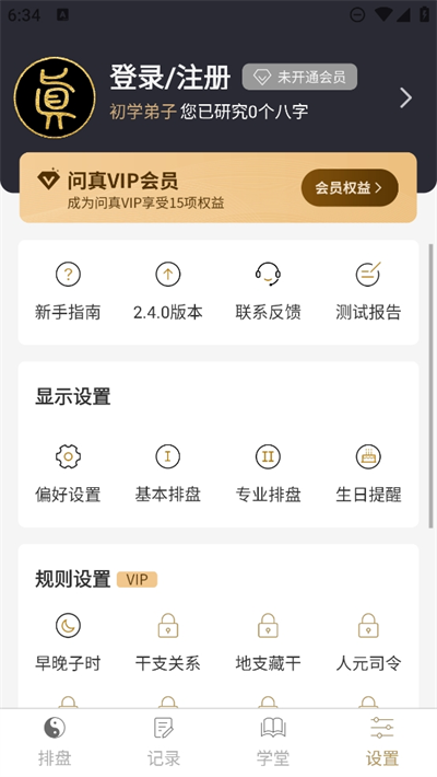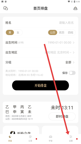 1、在首页排盘界面点击底部设置图标,进入设置页面查看功能选项。