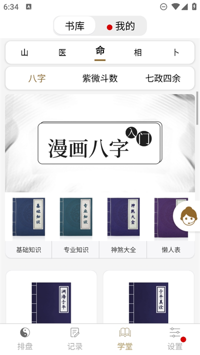 3、我们接着来看学堂,在学堂出可以看到有关八字相关的知识内容,并进行分类可以轻松找寻书籍;