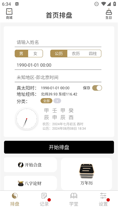 1、进入首页后,可以通过输入自己的基本信息进行个人排盘,查看排盘后的结果分析;