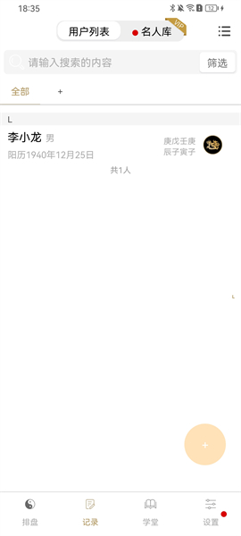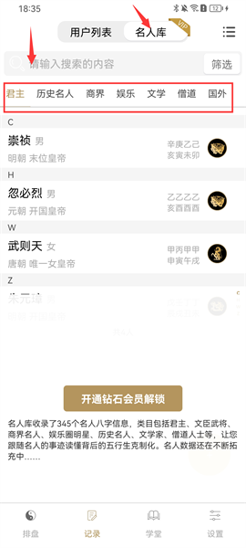 4、点击名人库,可以看到有君主/历史名人/商界/娱乐/文学等不同领域的名人全面八字信息,点击上方的搜索框也可快速搜索目标人物;