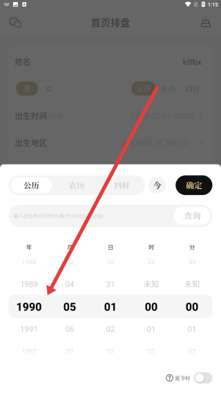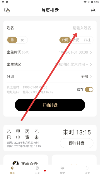 1、在首页排盘的姓名输入框填写名字,选定性别与历法,准备设置出生信息。