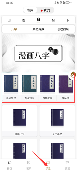 5、点击学堂页面,会有丰富的入门漫画八字书籍让大家免费浏览了解学习,新手也能够快速入门。