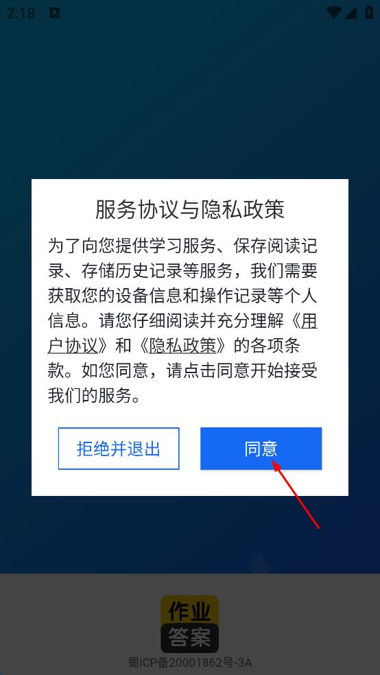 1、打开作业答案类APP,在弹出的服务协议与隐私政策提示框中,点击“同意”按钮。