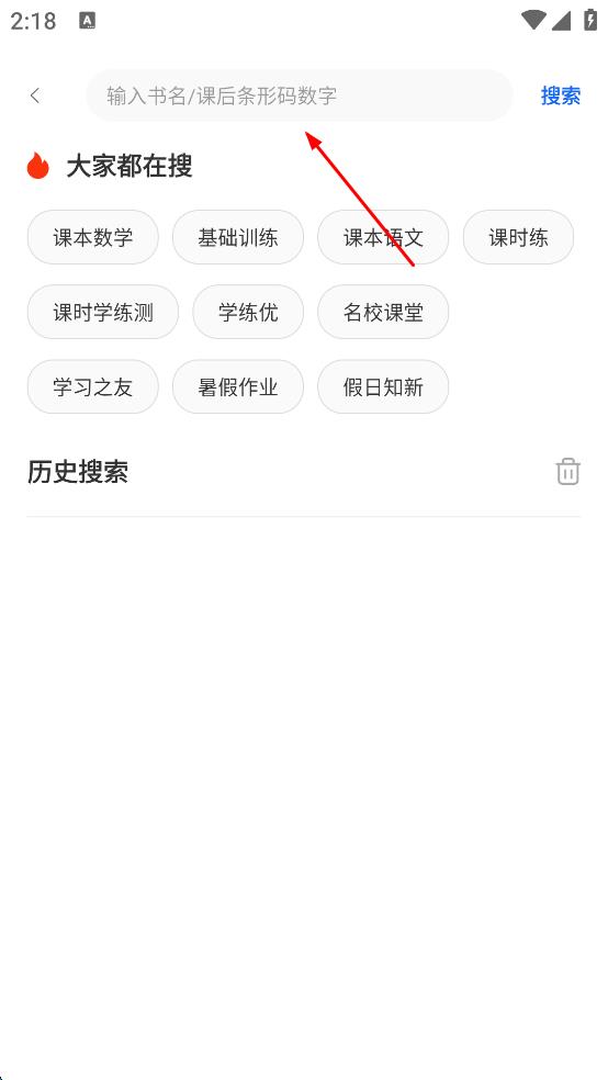 4、进入搜索页面后,在顶部的输入框中输入书名或者课后条形码数字,然后点击“搜索”按钮,查找对应的作业答案。
