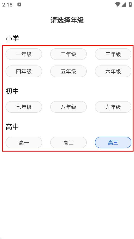 2、进入请选择年级页面后,在小学、初中、高中对应的年级选项中,点击自己所在的年级。